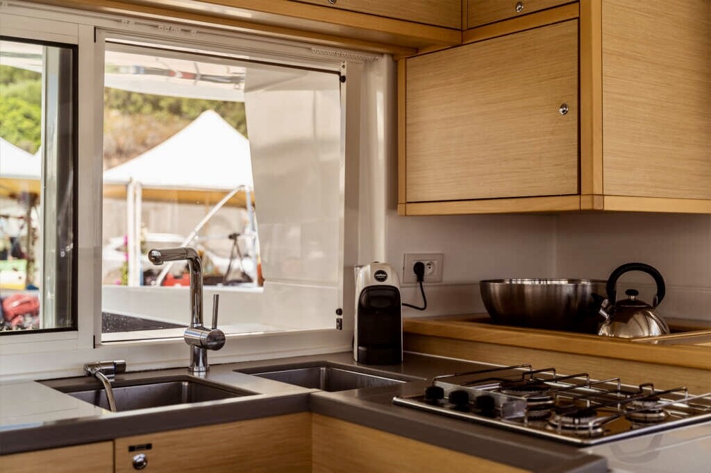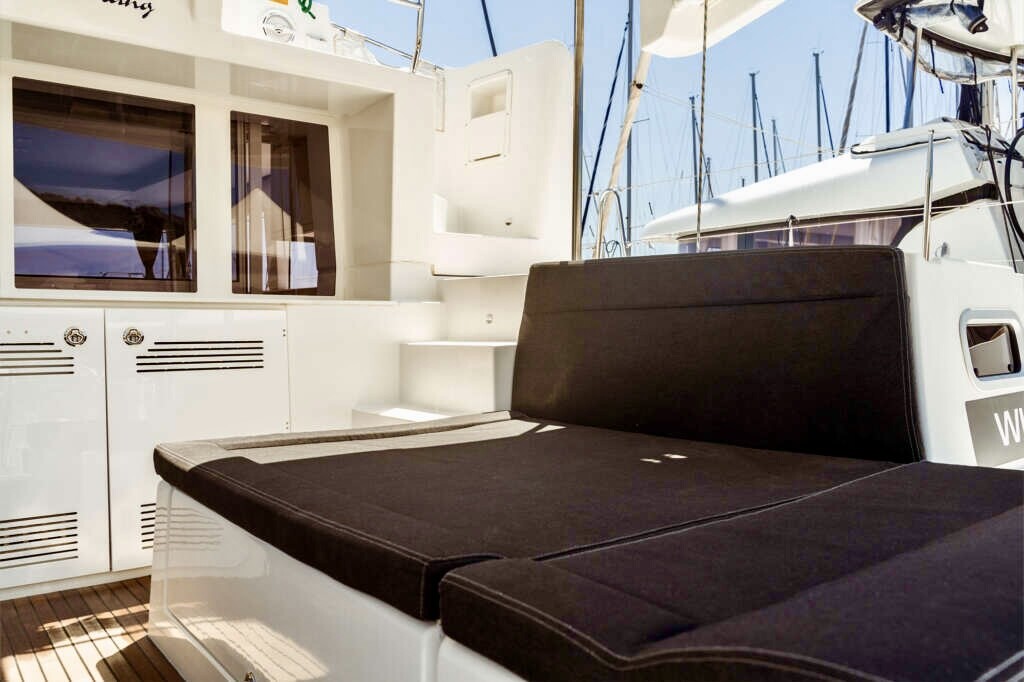Catamaran Lagoon 450 F EmoSEAon, built in 2018 is anchored in the Lefkas, D-Marin, Greece - Ionian Islands, Greece. It has 4 + 1 cabins, can accommodate 10 + 2 people and has 4 + 1 toilets. Bed linen and kitchen equipment are included in the price.
