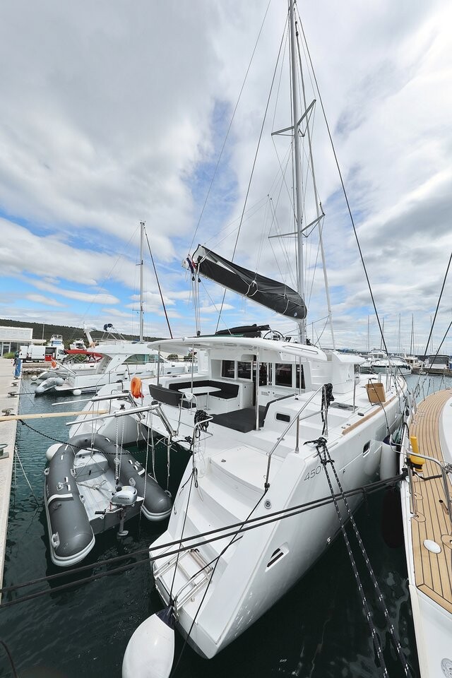 Catamaran Lagoon 450 F Must Have, built in 2018 is anchored in the Sukosan, D-Marin Dalmacija Marina, Croatia - Zadar, Croatia. It has 4 + 2 cabins, can accommodate 8 + 2 + 2 people and has 4 toilets. Bed linen and kitchen equipment are included in the price.