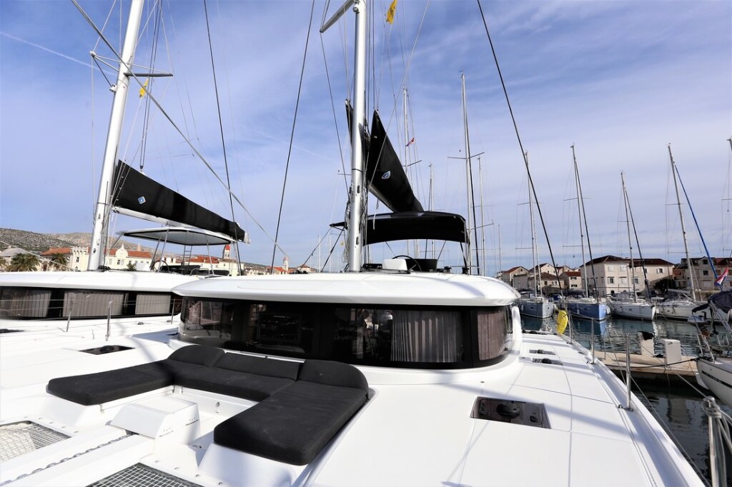Catamaran Lagoon 46 Lady Point, built in 2020 is anchored in the ACI Marina Trogir, Croatia - Split, Croatia. It has 4 + 2 cabins, can accommodate 8 + 2 people and has 4 toilets. Bed linen and kitchen equipment are included in the price.