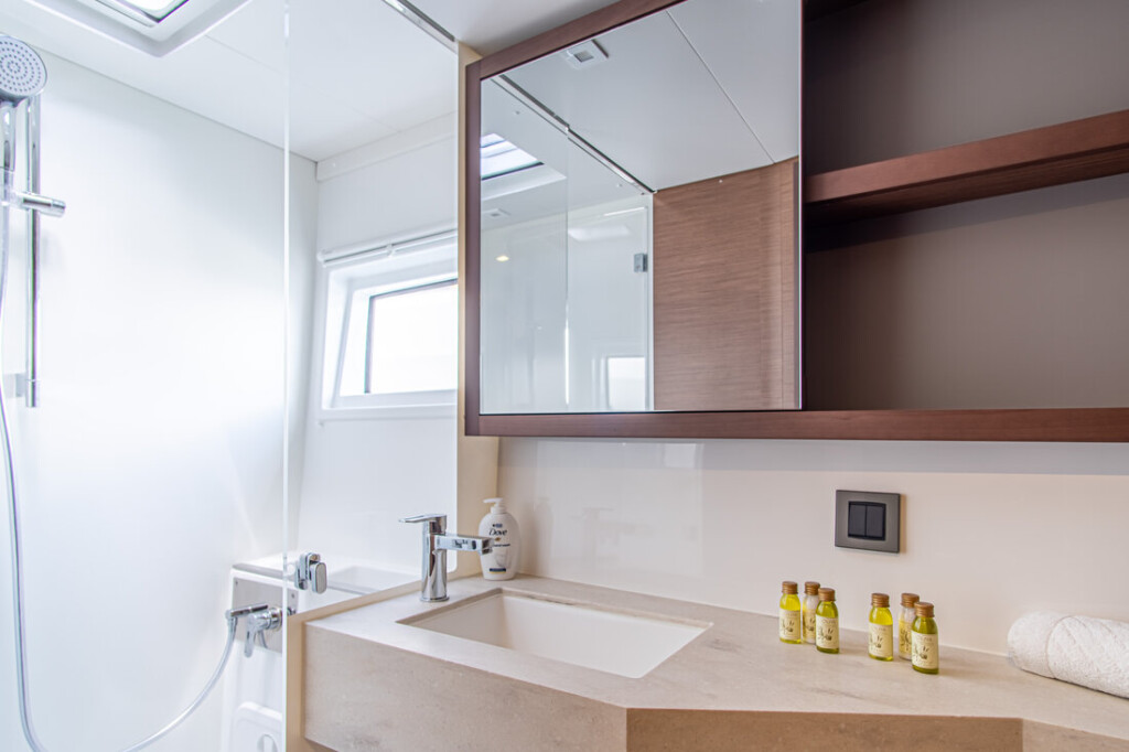 Catamaran Lagoon 46 Velvet Breeze, built in 2021 is anchored in the Marina Frapa, Rogoznica, Croatia - Sibenik, Croatia. It has 4 + 2 cabins, can accommodate 8 + 2 + 2 people and has 4 toilets. Bed linen and kitchen equipment are included in the price.