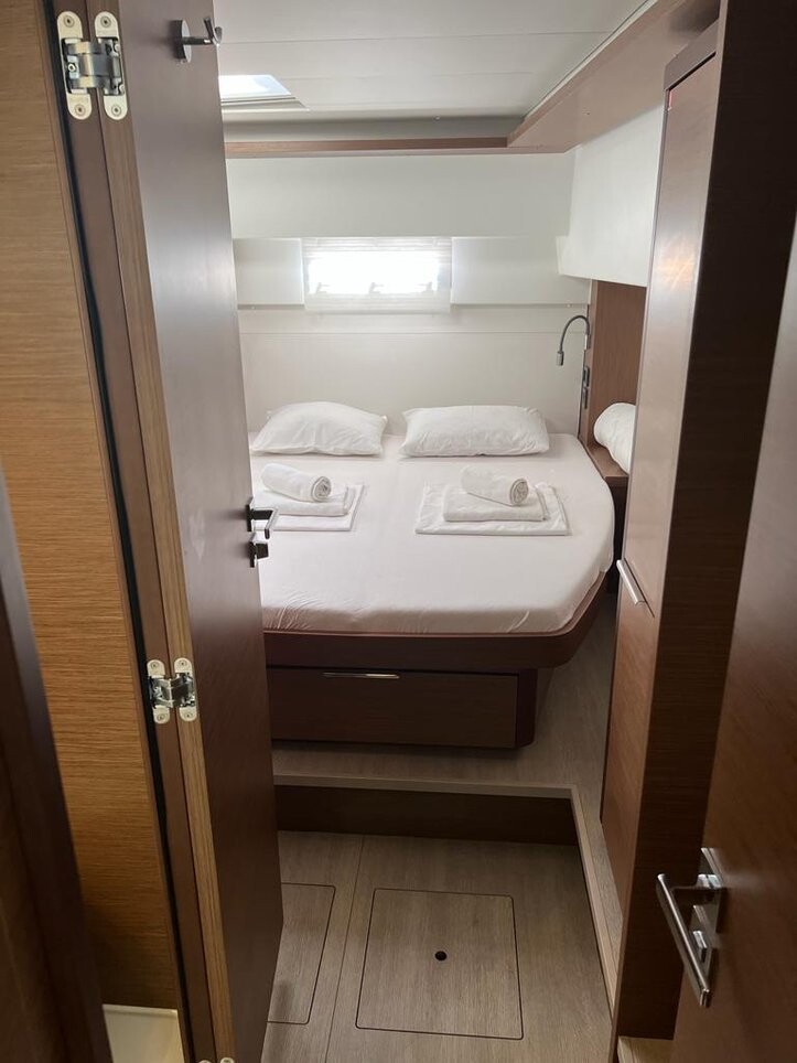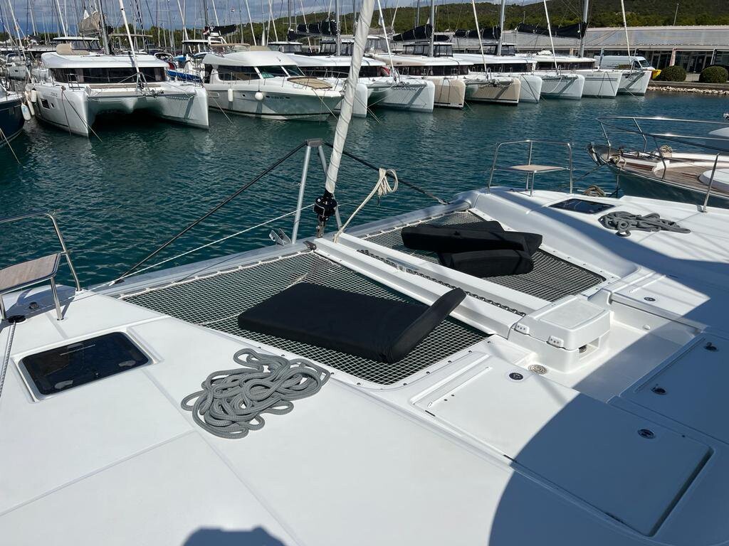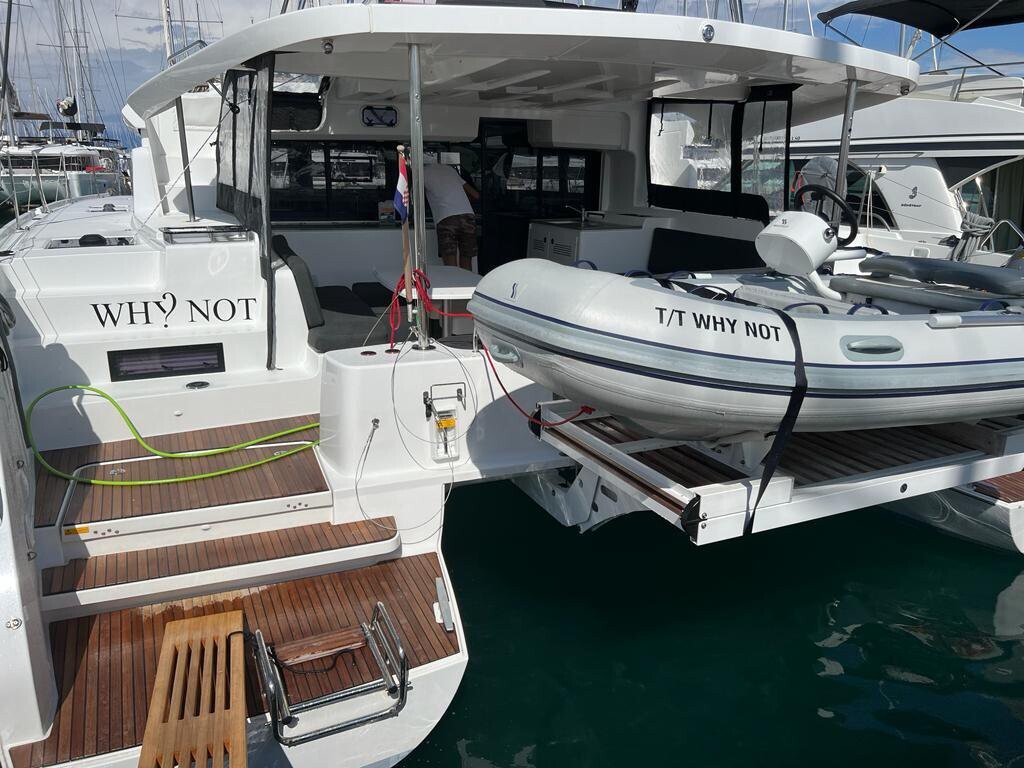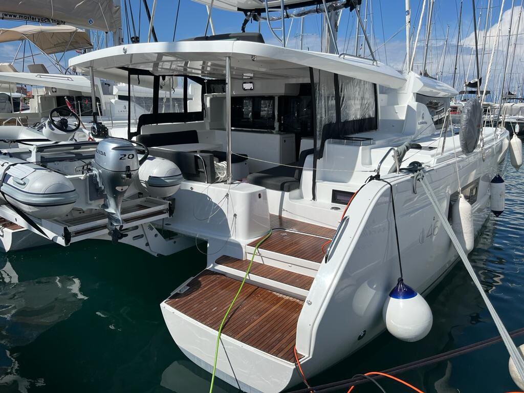 Catamaran Lagoon 46 Why Not, built in 2022 is anchored in the Sukosan, D-Marin Dalmacija Marina, Croatia - Zadar, Croatia. It has 4 + 2 cabins, can accommodate 8 + 2 + 2 people and has 4 toilets. Bed linen and kitchen equipment are included in the price.