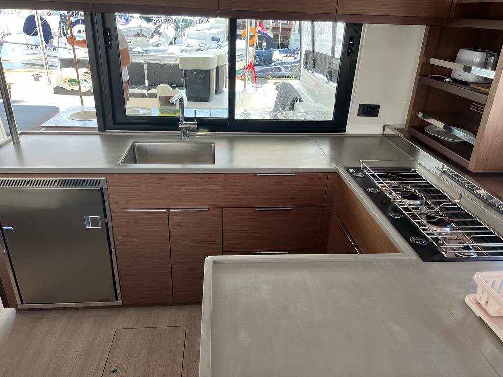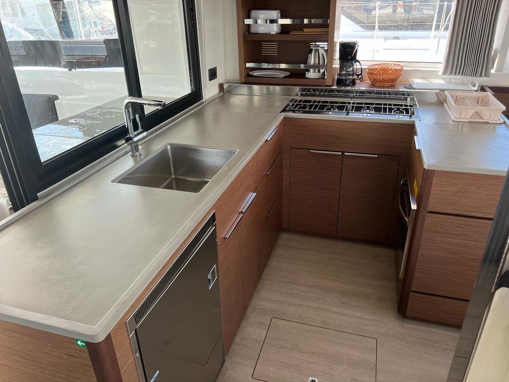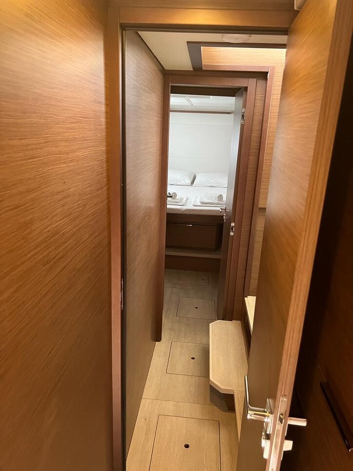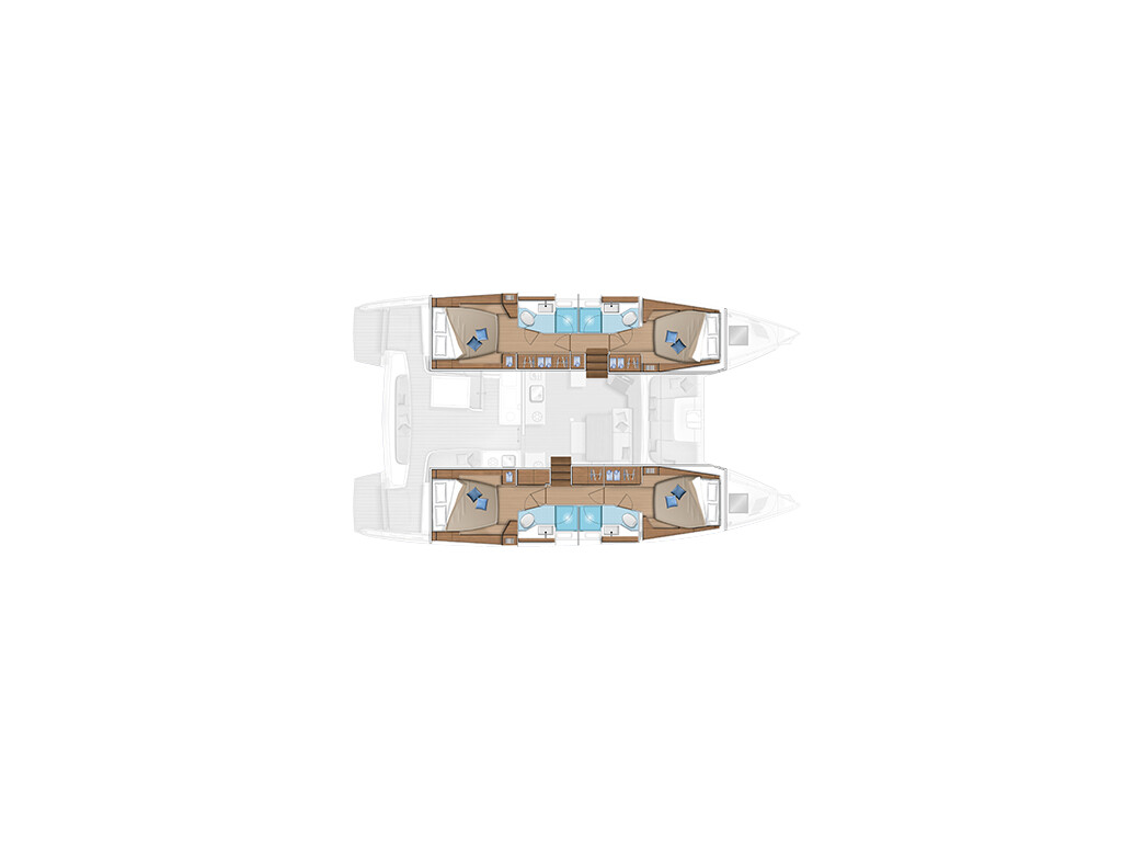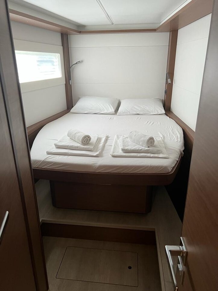 Catamaran Lagoon 46 Why Not, built in 2022 is anchored in the Sukosan, D-Marin Dalmacija Marina, Croatia - Zadar, Croatia. It has 4 + 2 cabins, can accommodate 8 + 2 + 2 people and has 4 toilets. Bed linen and kitchen equipment are included in the price.