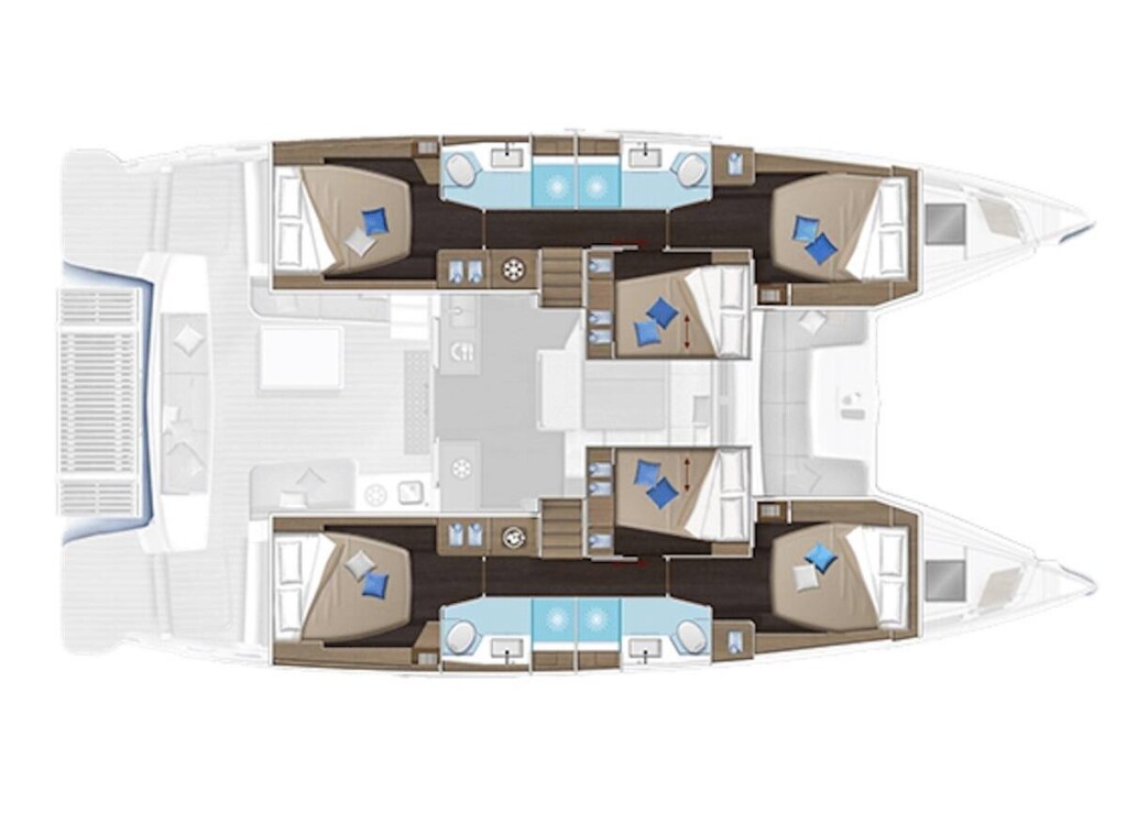 Catamaran Lagoon 51 Maestro, built in 2025 is anchored in the Trogir, Yachtclub Seget (Marina Baotić), Croatia - Split, Croatia. It has 6 + 2 cabins, can accommodate 12 + 2 + 2 people and has 4 toilets. Bed linen and kitchen equipment are included in the price.