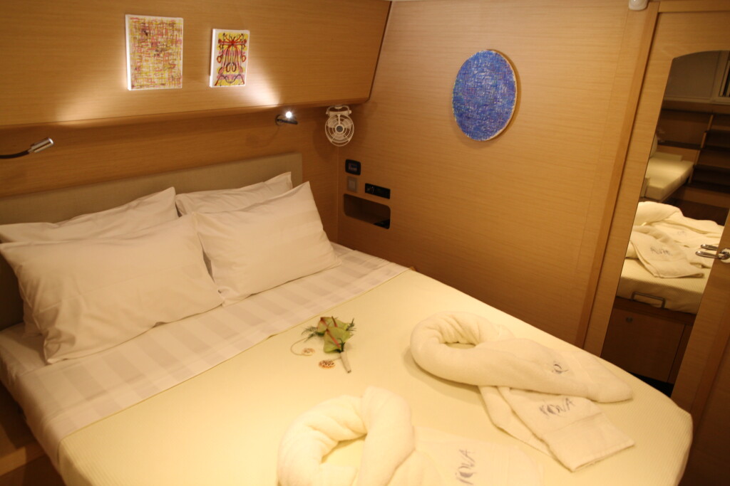 Catamaran Lagoon 620 Nova, built in 2011 is anchored in the Athens, Alimos marina, Greece - Peloponnese, Greece. It has 4 + 2 cabins, can accommodate 8 + 2 people and has 4 toilets. Bed linen and kitchen equipment are included in the price.