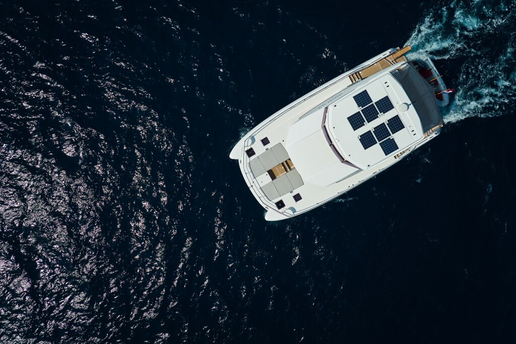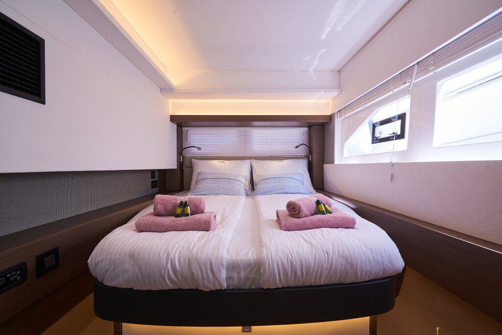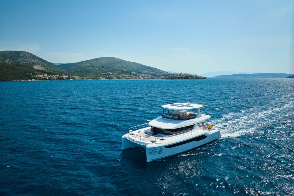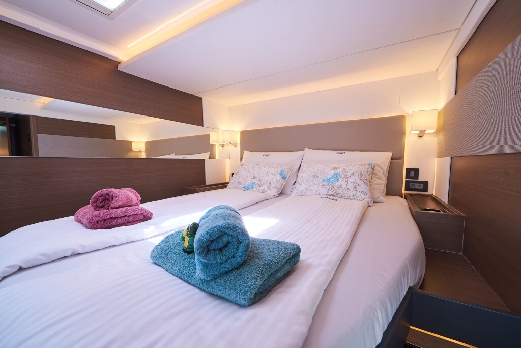 Power catamaran Leopard 53 - OW Good Vibes, built in 2021 is anchored in the Trogir, Yachtclub Seget (Marina Baotić), Croatia - Split, Croatia. It has 3 + 1 cabins, can accommodate 6 people and has 3 toilets. Bed linen and kitchen equipment are included in the price.