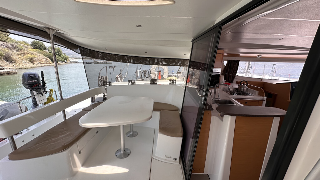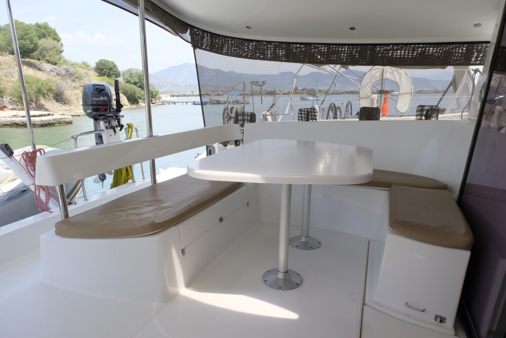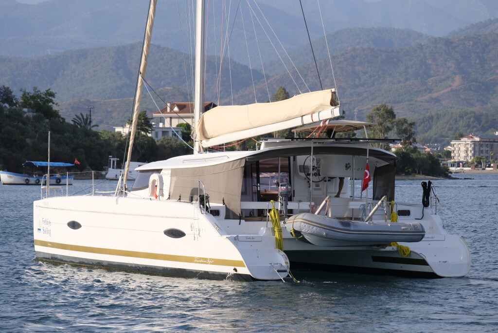 Catamaran Lipari 41 Mirada, built in 2013 is anchored in the Fethiye, Fethiye Sailing Club, Turkey - Aegean, Turkey. It has 4 + 2 cabins, can accommodate 8 + 2 people and has 4 toilets. Bed linen and kitchen equipment are included in the price.