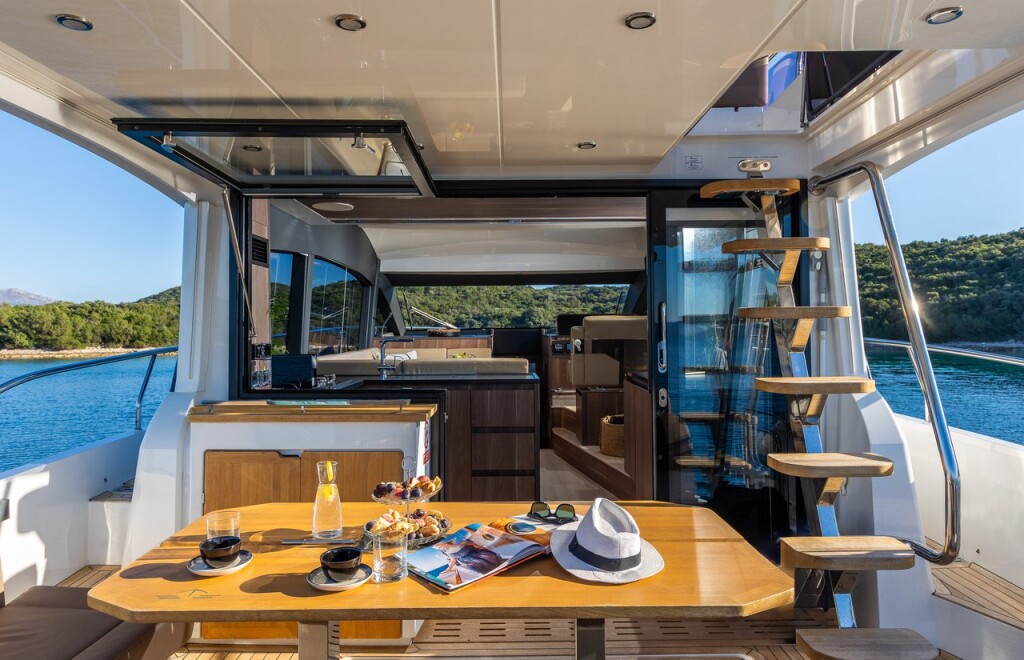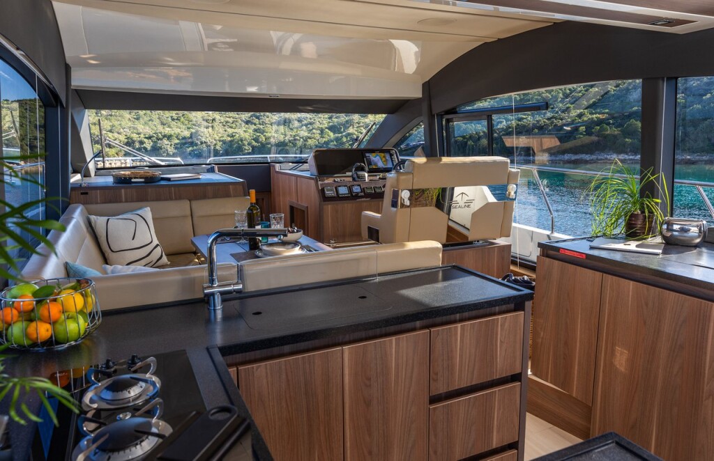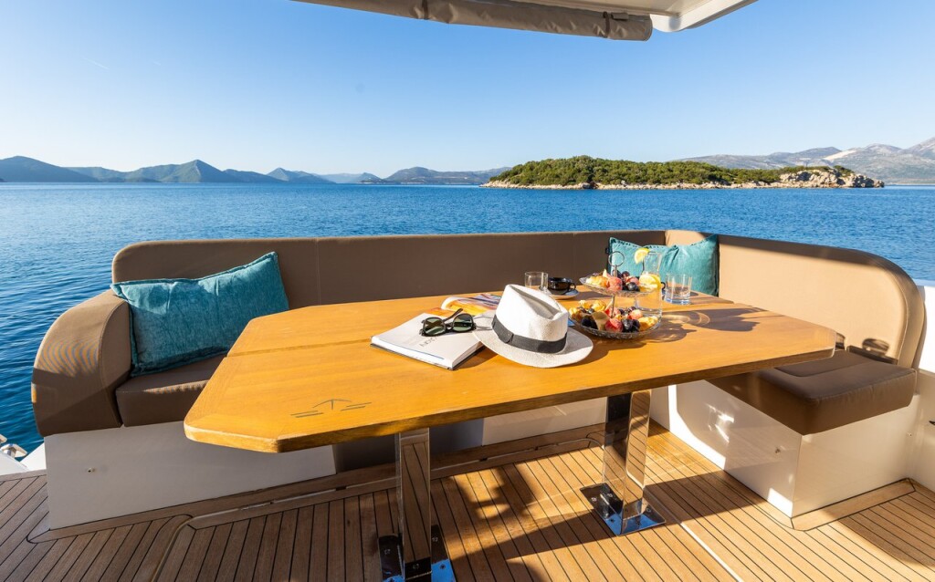 Motor yacht Sealine F430 Lomar, built in 2019 is anchored in the Dubrovnik, Town Port, Croatia - Dubrovnik, Croatia. It has 3 cabins, can accommodate 4 + 1 people and has 2 toilets. Bed linen and kitchen equipment are included in the price.