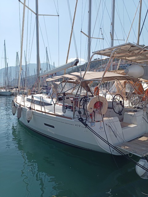 Sailing yacht Sun Odyssey 419 Foxy, built in 2017 is anchored in the Fethiye, Ece Saray Marina Resort, Turkey - Aegean, Turkey. It has 3 cabins, can accommodate 6 people and has 1 toilets. Bed linen and kitchen equipment are included in the price.