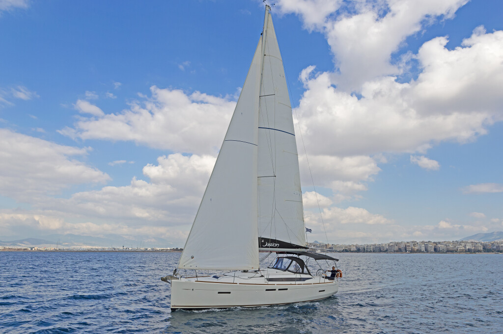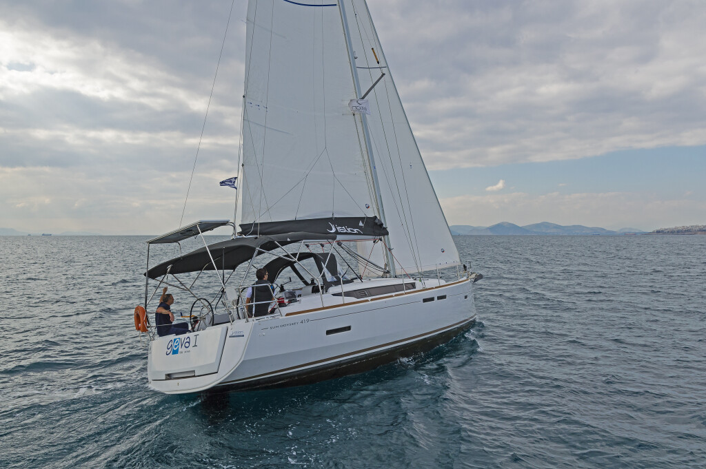 Sailing yacht Sun Odyssey 419 Geva I, built in 2018 is anchored in the Rhodes New Marina, Greece - Dodecanese, Greece. It has 3 cabins, can accommodate 6 + 2 people and has 2 toilets. Bed linen and kitchen equipment are included in the price.