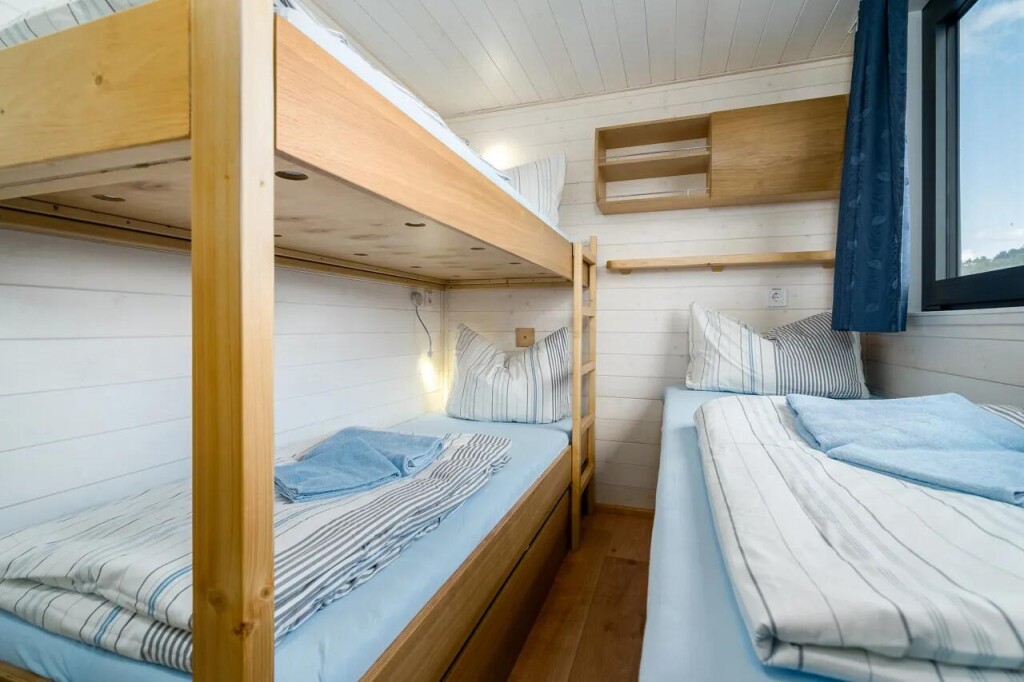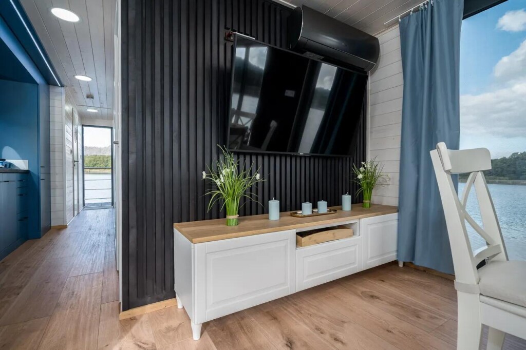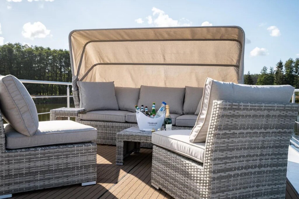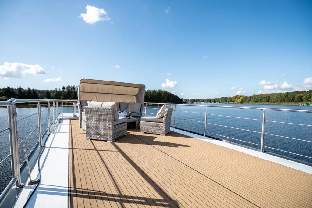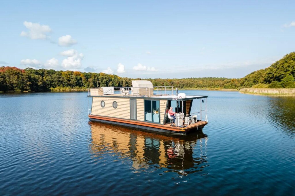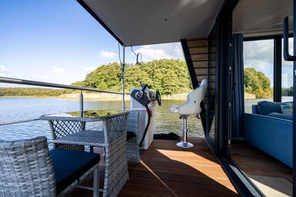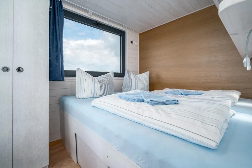 House boat Woma D13 Liberty, built in 2022 is anchored in the Röblinsee Marina, Germany - Brandenburg, Germany. It has 2 cabins, can accommodate 7 people and has 1 toilets. Bed linen and kitchen equipment are included in the price.